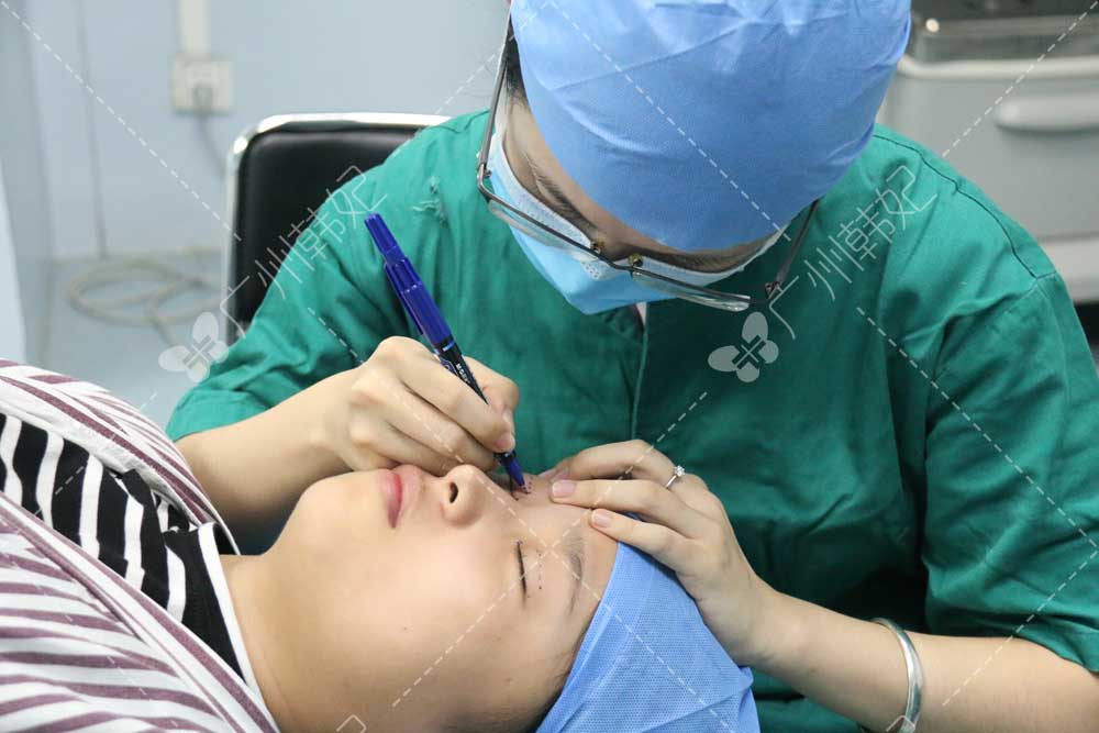 Before surgery, doctor help her mark double eyelid plasty line according her face contouring for best effect